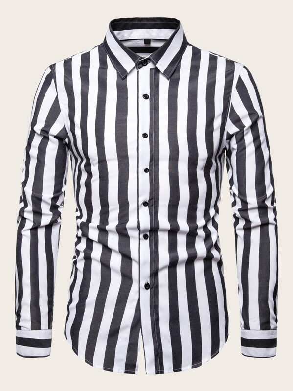 Men Black & White Vertical-Striped Shirt - $16.00 SGD