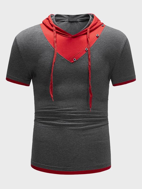 Men Contrast Binding Garment Eyelet Detail Drawstring Hooded Tee