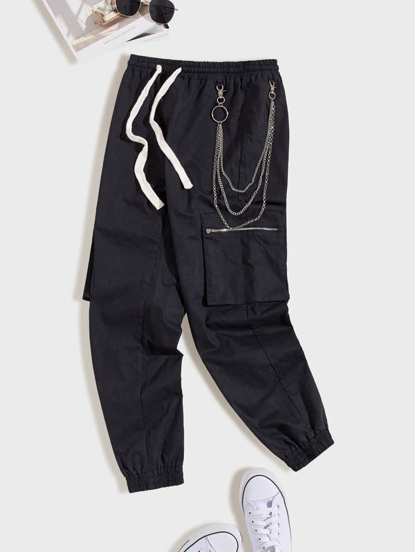 Men Drawstring Waist Pocket Patched Pants With Chain - $28.00 SGD