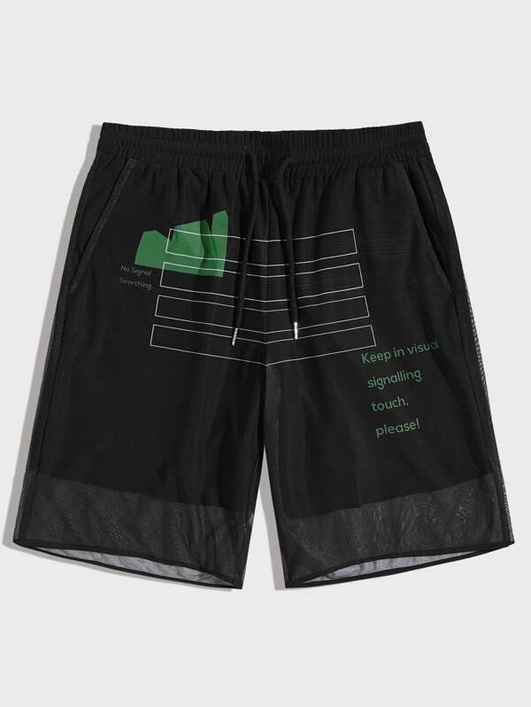 Men Drawstring Waist Slogan Graphic Mesh Overlay Shorts