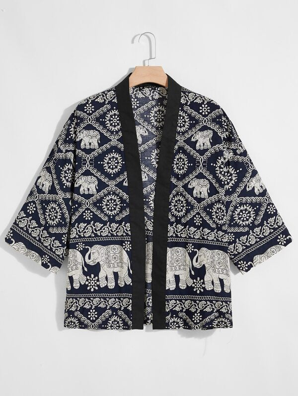 Men Drop Shoulder Contrast Edge Open Front Tribal Print Shirt