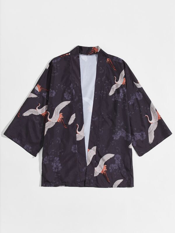 Men Floral And Crane Print Kimono