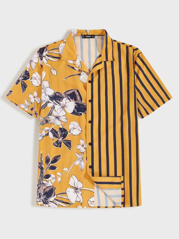 Men Notched Collar Floral & Striped Shirt - $26.00 SGD