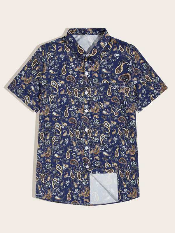 Men Paisley Print Pocket Front Button Up Shirt - $30.00 SGD