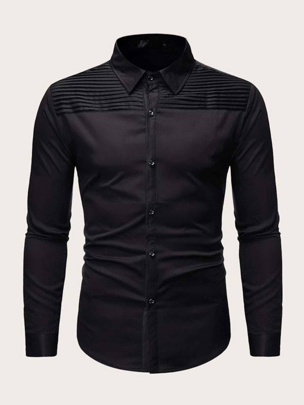 Men Pleated Decoration Button Up Shirt - $35.00 SGD