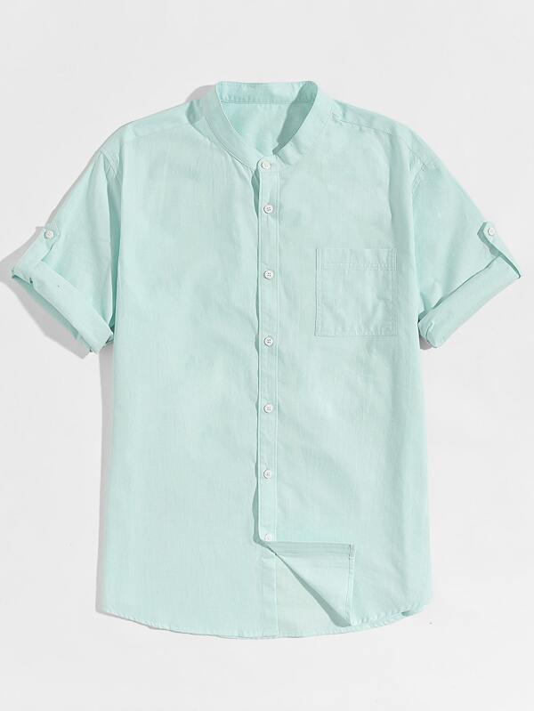 Men Stand Collar Roll Up Sleeve Shirt - $30.00 SGD