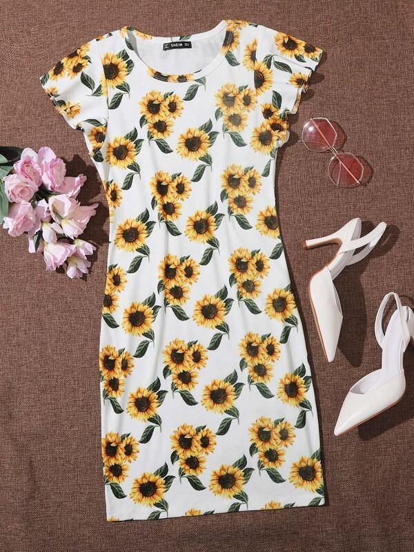 Butterfly Sleeve Sunflower Print Dress