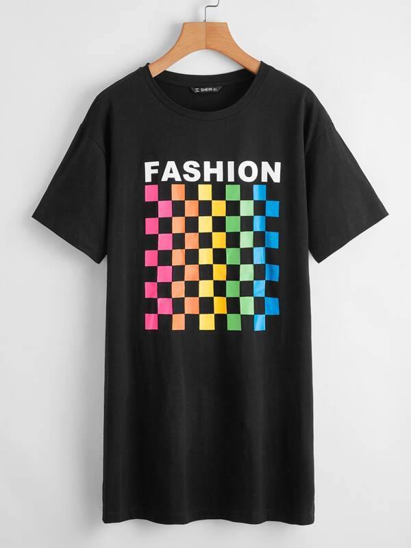 Checkered Panel Letter Graphic Tee Dress - $26.00 SGD