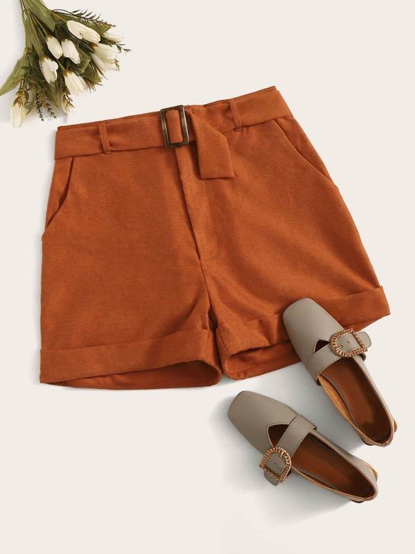 Corduroy Rolled Hem Square-ring Belted Shorts
