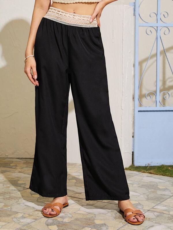 Crochet Panel Wide Leg Pants - $32.00 SGD