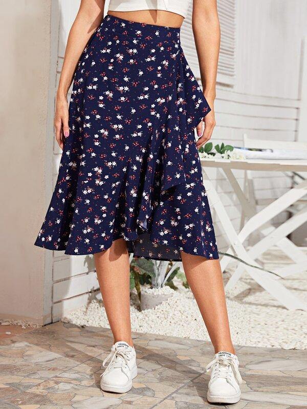 Ditsy Floral Asymmetric Ruffle Hem Skirt