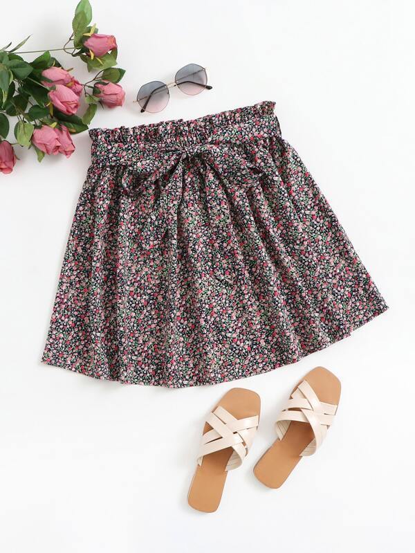 Ditsy Floral Print Paperbag Waist Belted Skirt