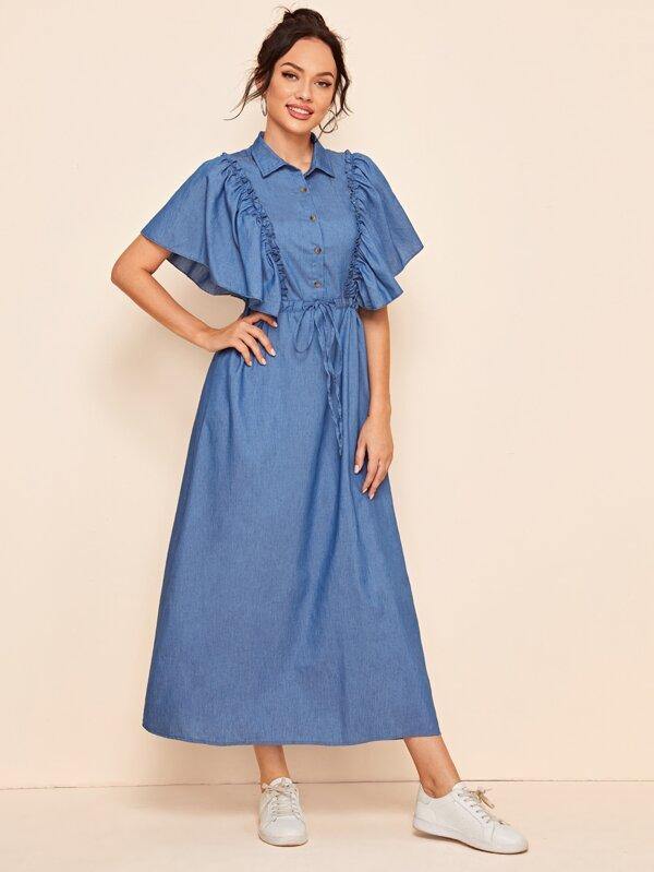 Drawstring Waist Butterfly Sleeve Shirt Dress
