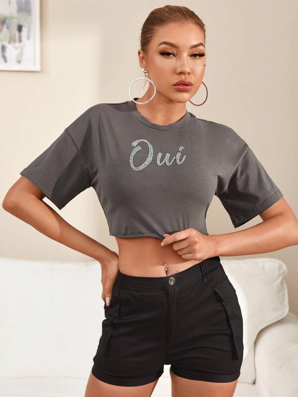 Drop Shoulder Rhinestone Letter Crop Tee - $28.00 SGD