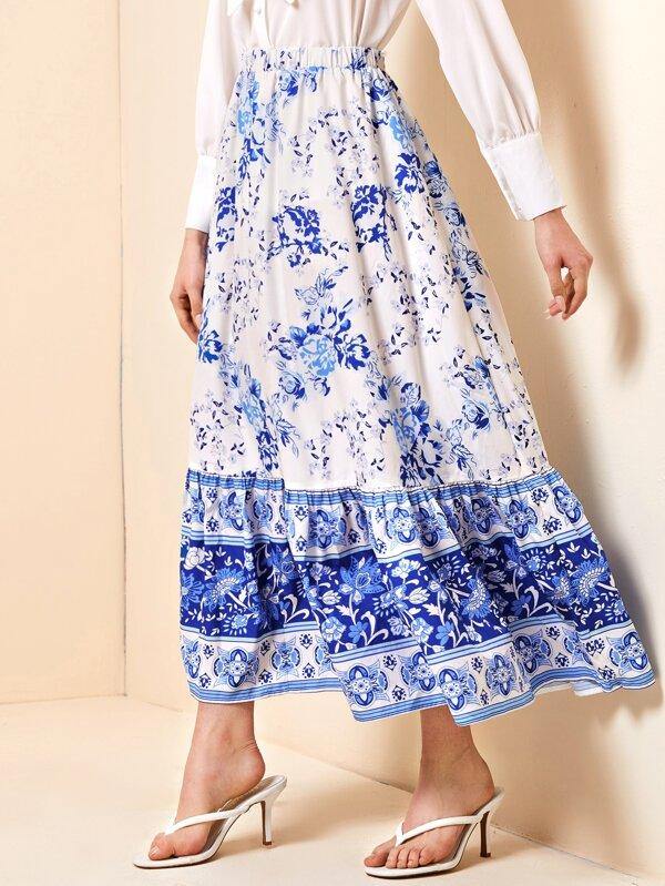 Elastic Waist Ruffle Hem Tribal Print Skirt