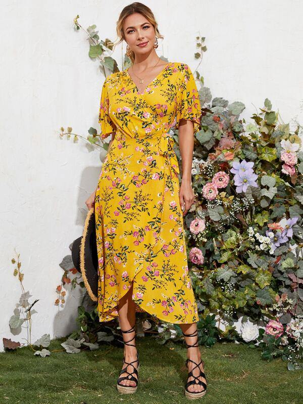 Floral Print Wrap Tie Side Dress - $35.00 SGD