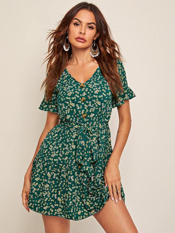 Flounce Sleeve Ditsy Floral Belted Dress - $21.00 SGD
