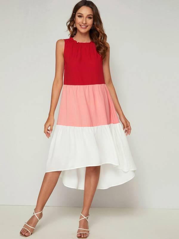 Frill Trim Colorblock Dip Hem Dress - $33.00 SGD