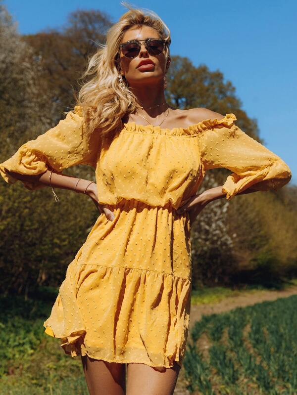 Frill Trim Off Shoulder Swiss Dot Dress - $29.00 SGD