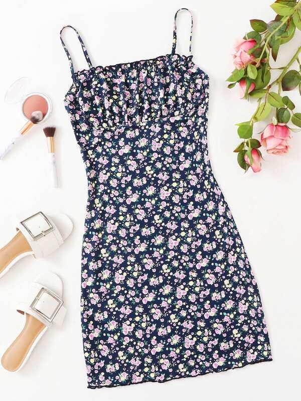 Frill Trim Ruched Bust Floral Slip Dress - $33.00 SGD