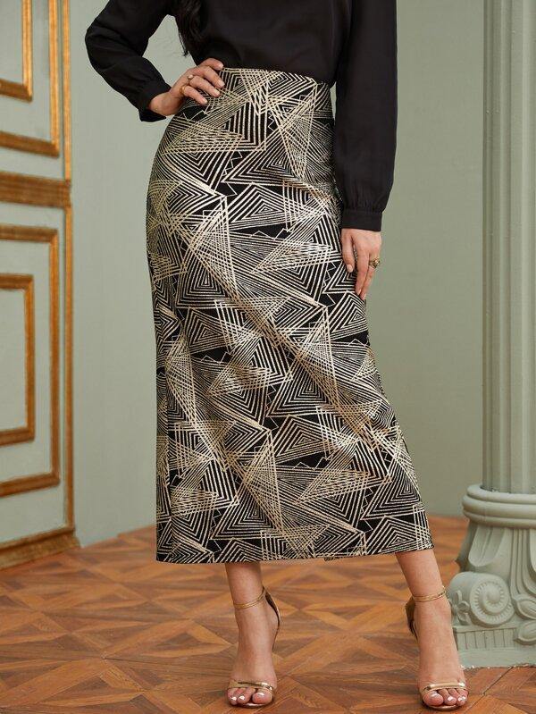 Geo Print Zip Back Split Thigh Skirt - $34.00 SGD