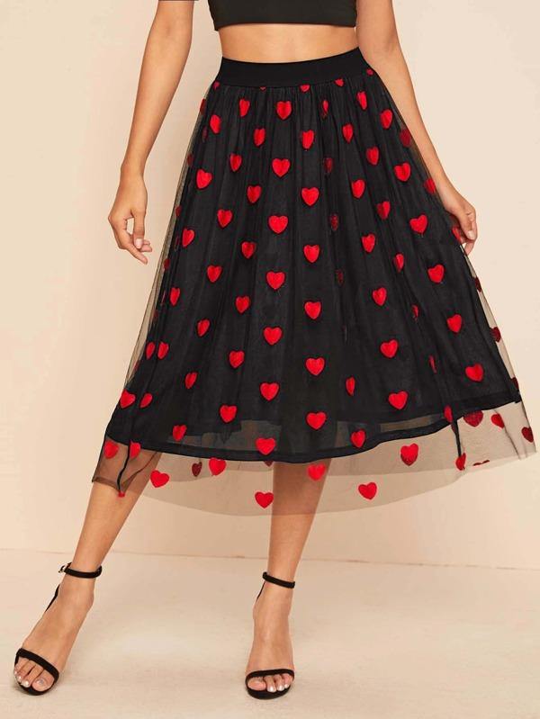 Heart Embroidery Mesh Flare Skirt - $30.00 SGD