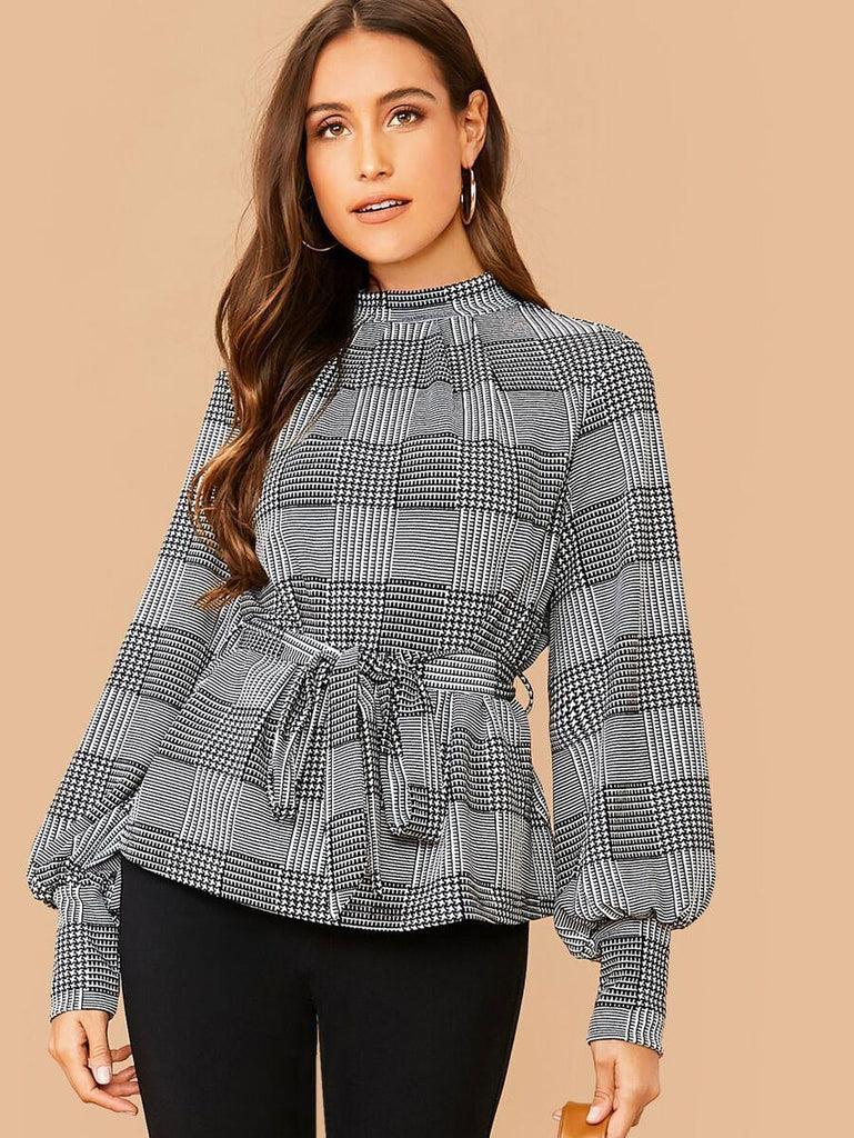 Keyhole Back Lantern Sleeve Belted Plaid Blouse