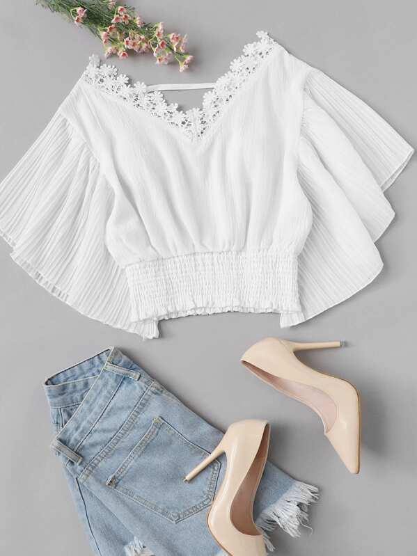 Lace Trim Pleated Sleeve Shirred Crop Top