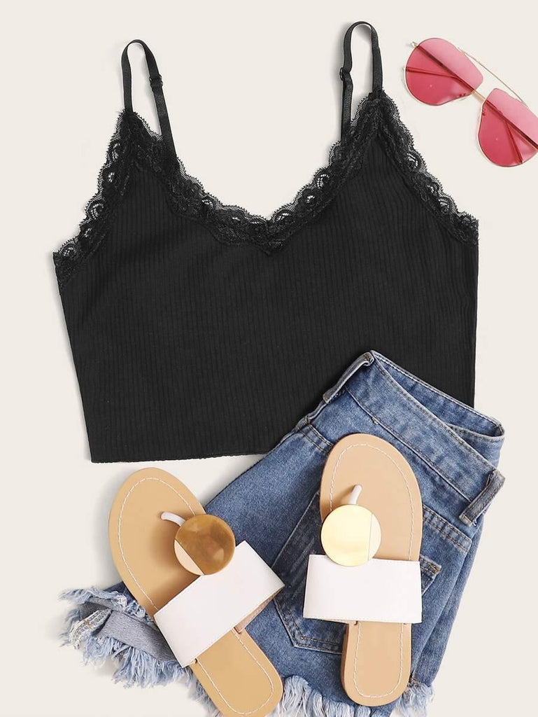 Lace Trim Rib-knit Crop Cami Top - $23.00 SGD