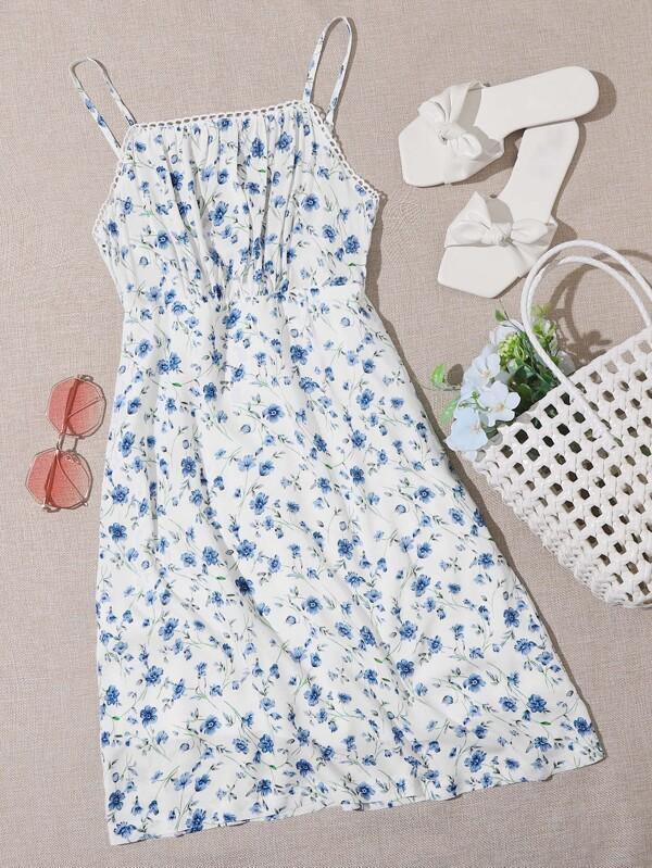 Lace Trim Ruched Bust Floral Cami Dress
