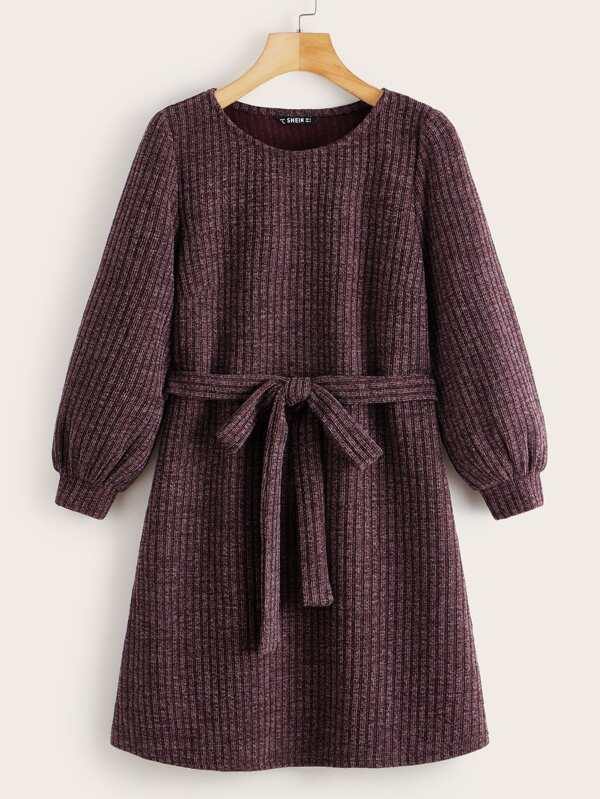Lantern Sleeve Rib-knit Belted Dress - $19.00 SGD