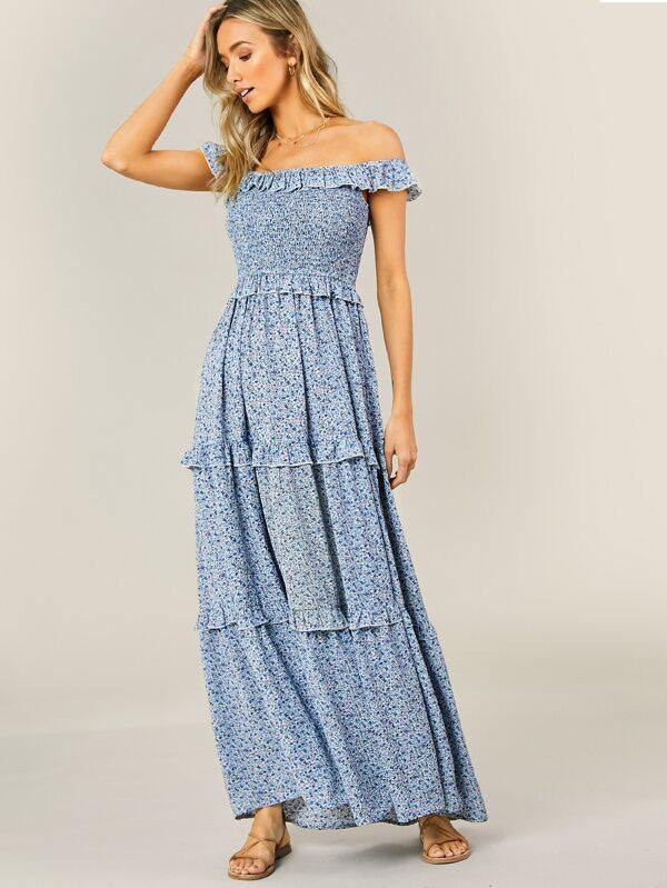 Layered Ruffle Detail Ditsy Floral Shirred Bardot Dress