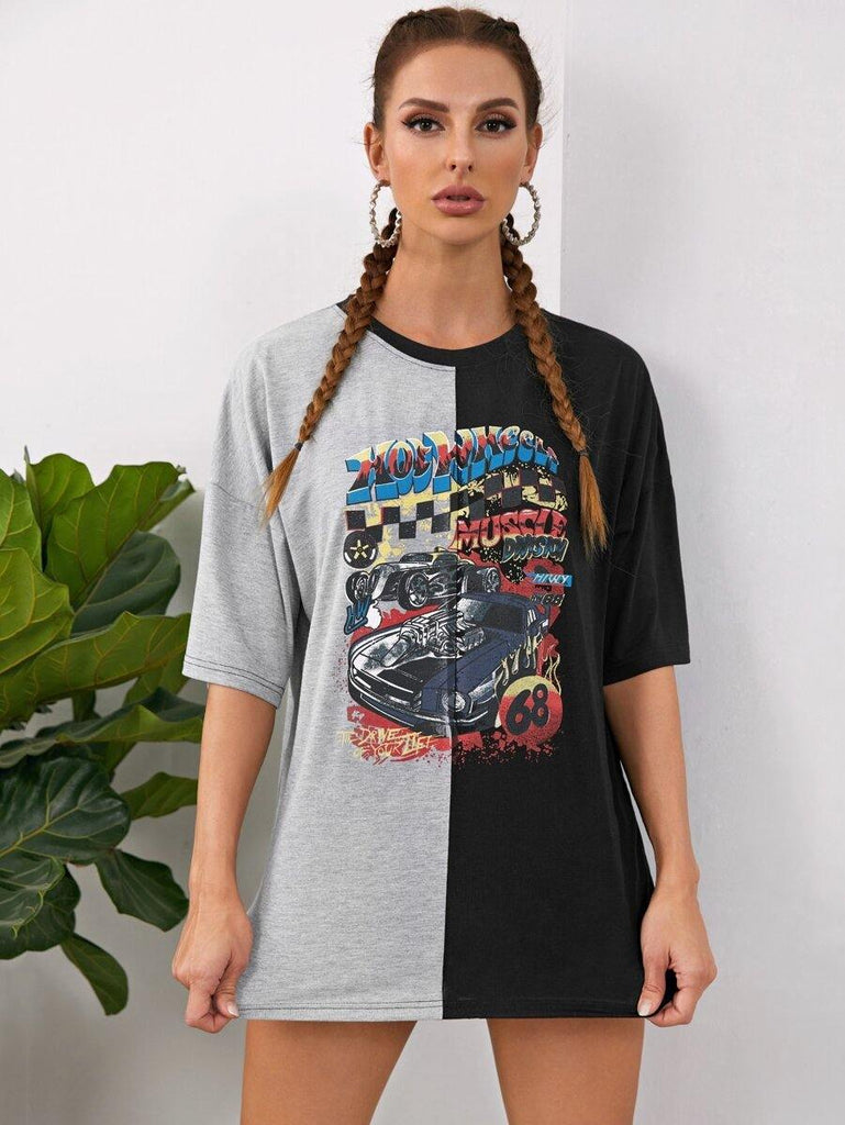 Letter And Car Print Spliced Oversized Tee - $21.00 SGD