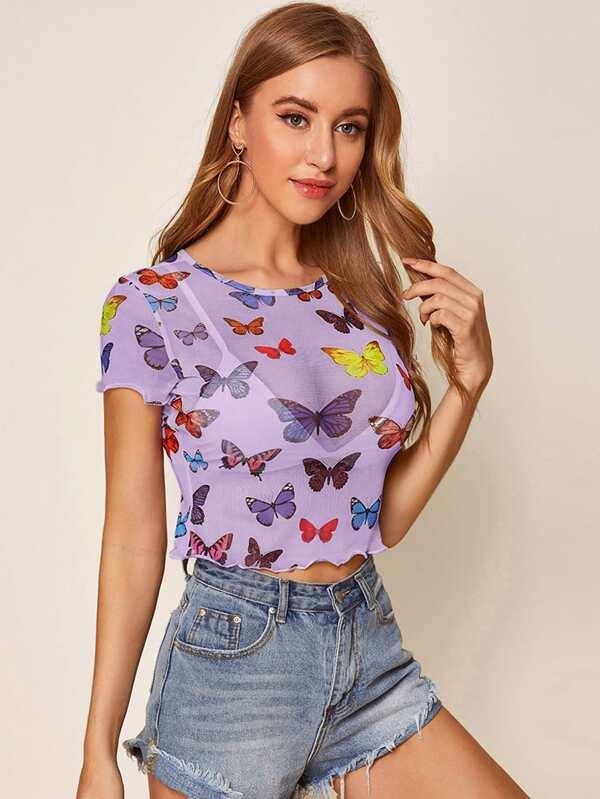 Lettuce Edge Butterfly Mesh Crop Top Without Bra