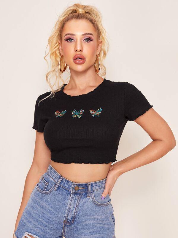 Lettuce Trim Embroidered Butterfly Crop Tee