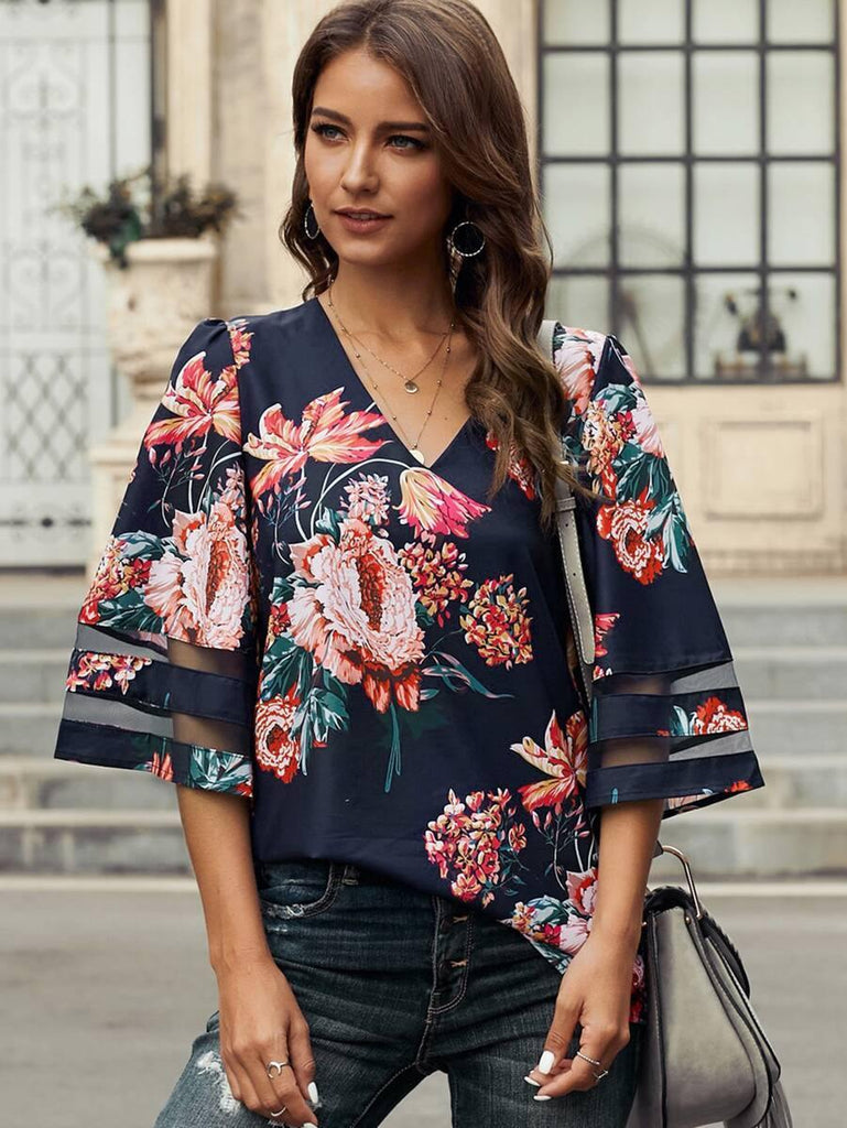 Mesh Panel V-neck Floral Print Blouse - $34.00 SGD