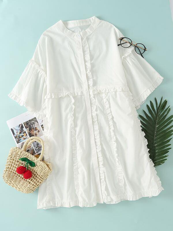 Mock Neck Frill Trim Shirt Dress - $29.00 SGD