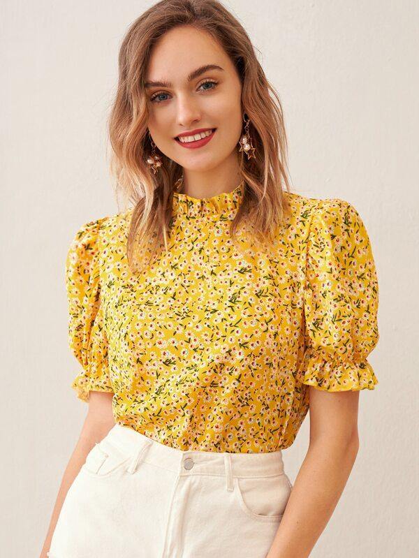 Mock-Neck Ruffle Trim Ditsy Floral Top