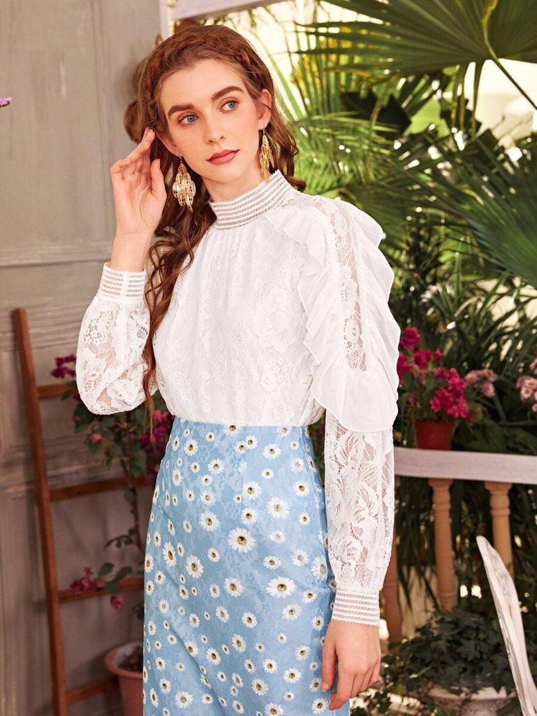 Mock Neck Ruffle Trim Lace Blouse