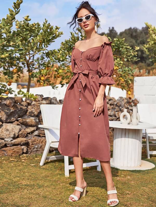 Off Shoulder Button Front Belted Dress - $25.00 SGD