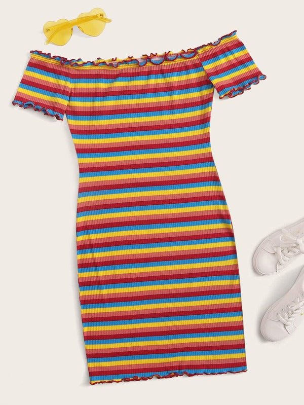Off Shoulder Lettuce Trim Rib-knit Rainbow Striped Dress