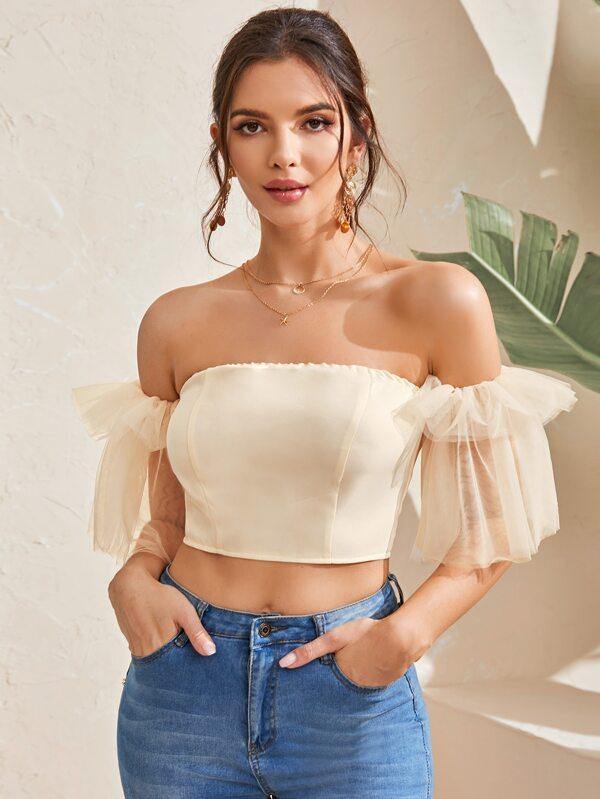 Off Shoulder Mesh Sleeve Crop Top