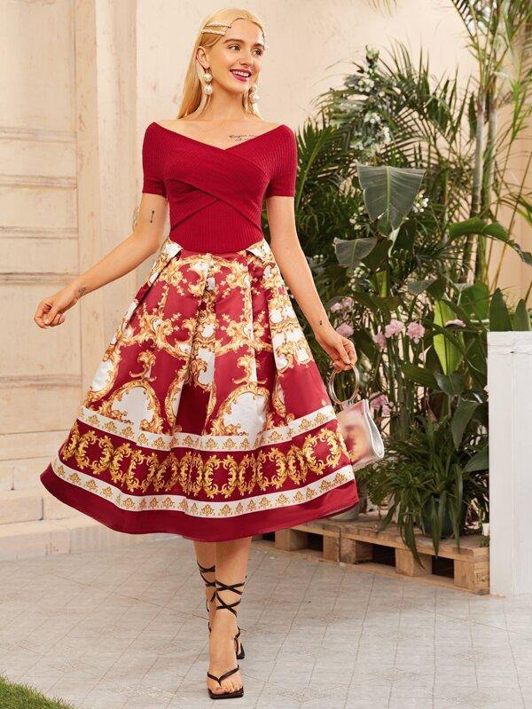Off Shoulder Rib-knit Cross Wrap Baroque Combo Dress