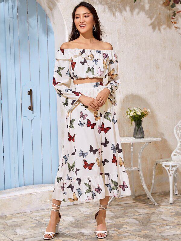 Off Shoulder Ruffle Trim Butterfly Print Crop Top - $34.00 SGD