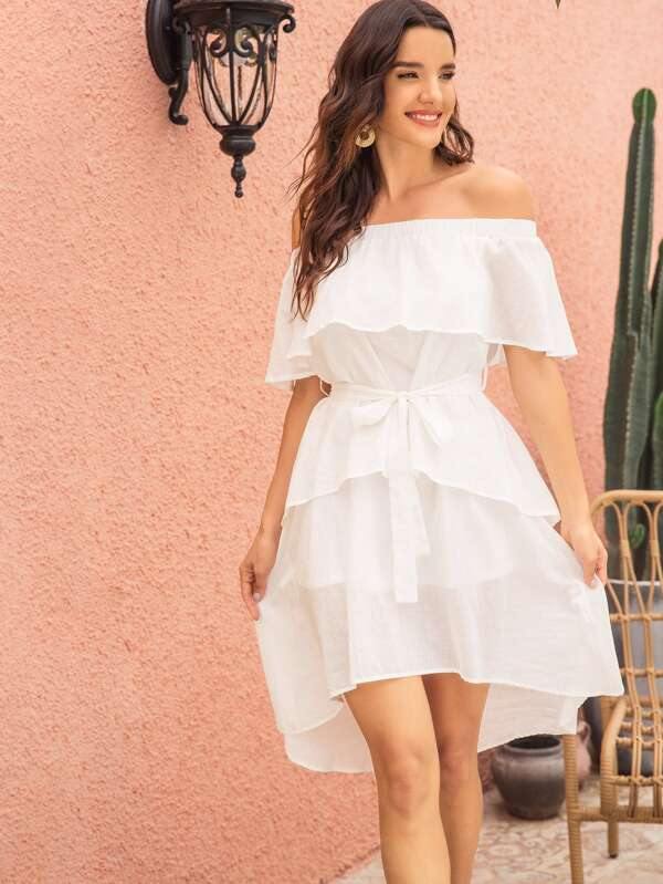 Off The Shoulder Asymmetrical Hem Belted Dress