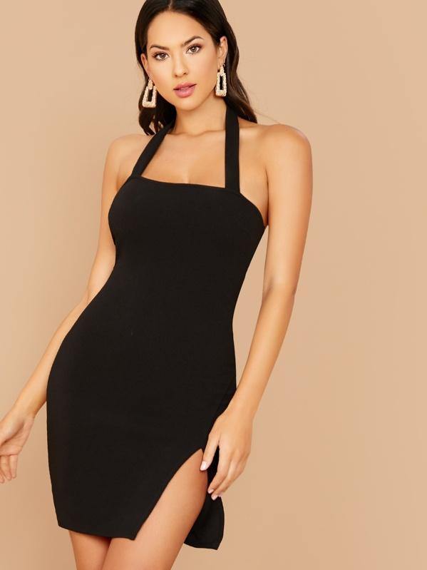 Open Back Split Side Bodycon Halter Dress - $26.00 SGD