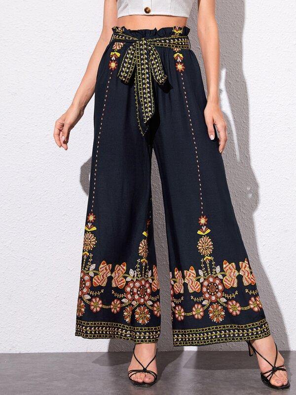 Paperbag Waist Floral Embroidery Wide Leg Pants