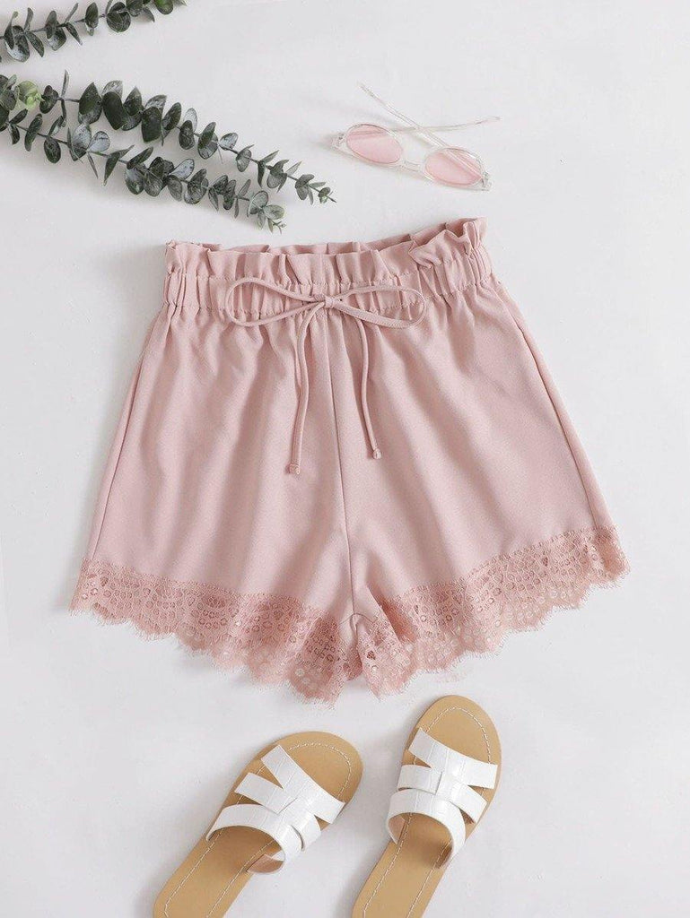 Paperbag Waist Tie Front Eyelash Lace Trim Shorts