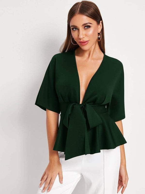 Plunging Tie Front Peplum Top - $18.00 SGD