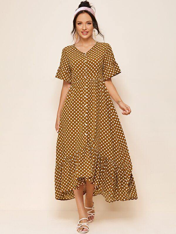 Polka Dot Asymmetrical Ruffle Hem A-line Dress